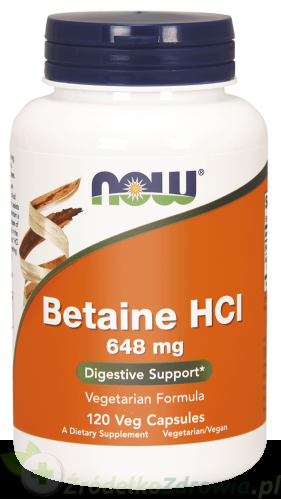 NOW® BetaineHCl (chlorowodorek betainy z pepsyną) ma w swojej formule dwa bardzo ważne składniki procesu trawienia: kwas solny oraz pepsynę. Kwas solny zapewnia odpowiednią kwasowość środowiska wspierającą proces trawienia oraz tworzy właściwe warunki dla wchłaniania składników odżywczych w jelicie i dla utrzymania zdrowej równowagi bakterii jelitowych. Pepsyna jest enzymem, który częściowo rozkłada białka w produktach spożywczych. Kwas solny oraz pepsyna stanowią zestaw tradycyjnie wykorzystywany do wspierania uwalniania składników odżywczych z pożywienia i do wspierania prawidłowego trawienia.