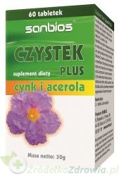 CZYSTEK PLUS to połączenie trzech składników (czystek, acerola, cynk) bogatych w dobroczynnie działające polifenole (czystek), naturalną witaminę C (acerola) i cynk.