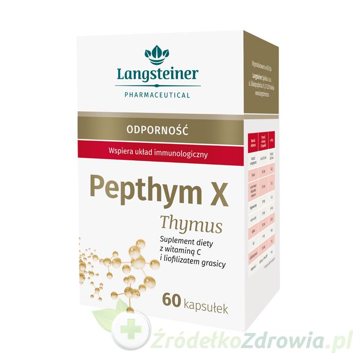 Zawiera wyciąg z grasicy cielęcej i witaminę C. Grasica stanowi niezbędny element układu immunologicznego, ponieważ w niej tworzą się tymocyty, czyli białe krwinki konieczne do skutecznego zwalczania infekcji. Niestety, ten gruczoł z wiekiem ulega stopniowemu zanikowi i tym samym osłabia układ odpornościowy. Witamina C stymuluje proces fagocytozy, a więc pochłaniania chorobotwórczych ustrojów przez białe krwinki. Człowiek nie ma możliwości syntetyzowania tej witaminy, więc musi być ona dostarczana w pożywieniu lub suplementach. W Pepthym X Thymus witamina C jest w formie biologicznie czynnej pod postacią kwasu L-askorbinowego.