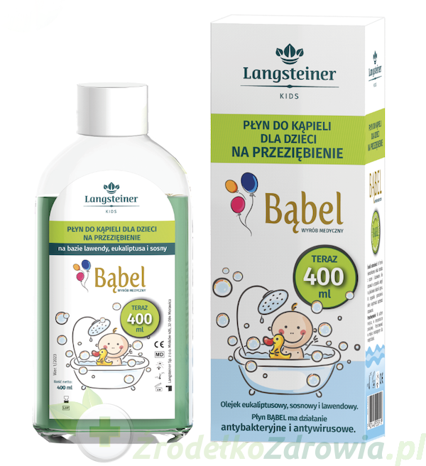 BĄBEL wyrób medyczny, to płyn do kąpieli na przeziębienie dla dzieci, na bazie olejku eukaliptusowego, lawendowego i sosnowego.