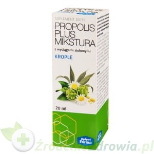 Propolis Plus Mikstura to preparat złożony z ekstraktów z propolisu oraz ziół takich jak: babki lancetowatej, rumianku, karczocha zwyczajnego i mięty pieprzowej. Preparat zawiera naturalne, wysokoskoncentrowane składniki, które wspomagają trawienie, przyczyniają się do prawidłowego funkcjonowania przewodu pokarmowego, działają korzystnie i ochronnie na żołądek, jelita i wątrobę. Głównymi składnikami preparatu są propolis, wyciągi ziołowe z babki lancetowatej, rumianku, karczocha i mięty pieprzowej. Propolis wpływa korzystnie na funkcjonowanie żołądka i dwunastnicy, sprzyja utrzymaniu równowagi mikrobiologicznej w przewodzie pokarmowym, wspomaga prawidłowe funkcjonowanie wątroby. Wyciąg z liści babki lancetowatej wpływa korzystnie na stan błon śluzowych przewodu pokarmowego. Wyciąg z rumianku pospolitego pomaga w łagodzeniu skurczów spastycznych żołądka i jelit. Karczoch zwyczajny pobudza wytwarzanie soków trawiennych. Mięta pieprzowa łagodzi dolegliwości kurczowe w obrębie żołądka, jelit jak również pęcherzyka i dróg żółciowych.