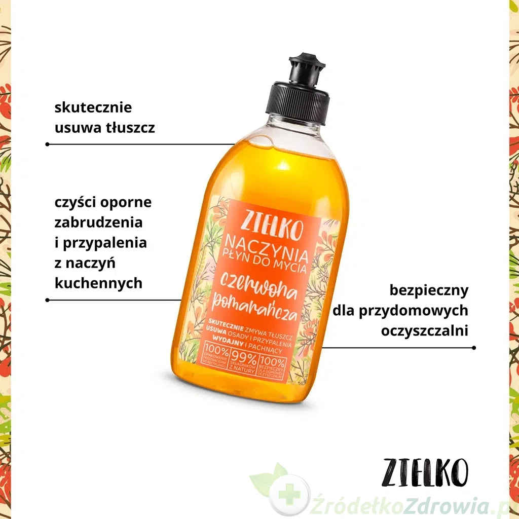 Płyn ZIELKO to nie tylko wydajność i skuteczność. Produkt posiada także przyjemny zapach czerwonej pomarańczy, który wypełnia kuchnię powiewem świeżości. Dzięki temu codzienne mycie naczyń staje się prawdziwą przyjemnością.