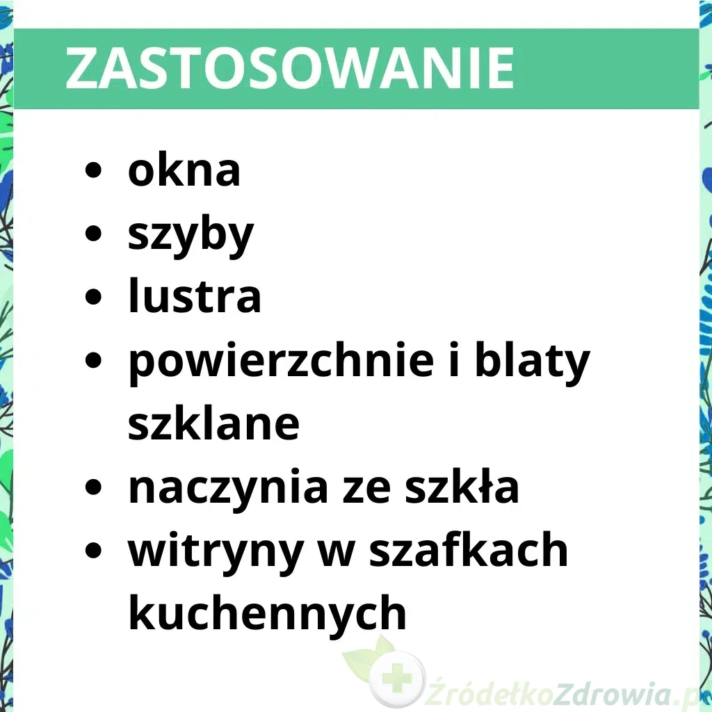 Skoncentrowana formuła skutecznie eliminuje zabrudzenia z szyb i luster. Doskonale sprawdza się przy myciu okien, szklanych blatów i powierzchni, luster, naczyń ze szkła, witryn kuchennych, porcelanowych ozdób, gładkich powierzchni laminowanych, kryształów oraz ekranów i monitorów.